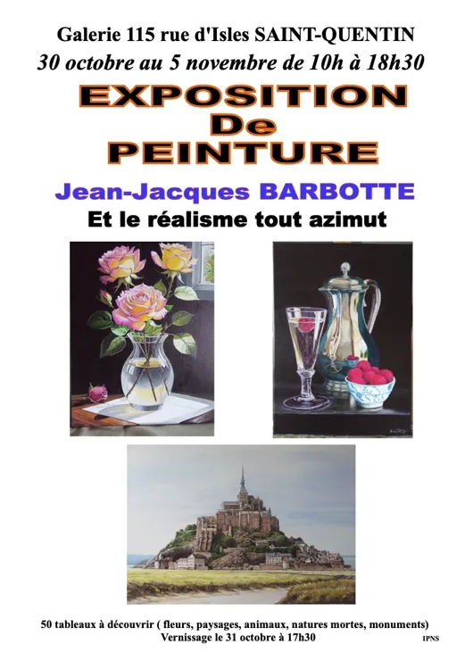 Le peintre jean-jacques BARBOTTE vous propose un voyage où le réalisme vous emportera dans des paysages bucoliques , des animaux aux regards expressifs, des fleurs où l'on pourrait presque sentir leur parfum, des natures mortes plus que vivantes, des monuments sublimés, un régal des yeux tout azimut, dans un écrin de lumière. du 30 octobre au 5 novembre de 10h à 18h30. vernissage le 31 octobre à 17h30.