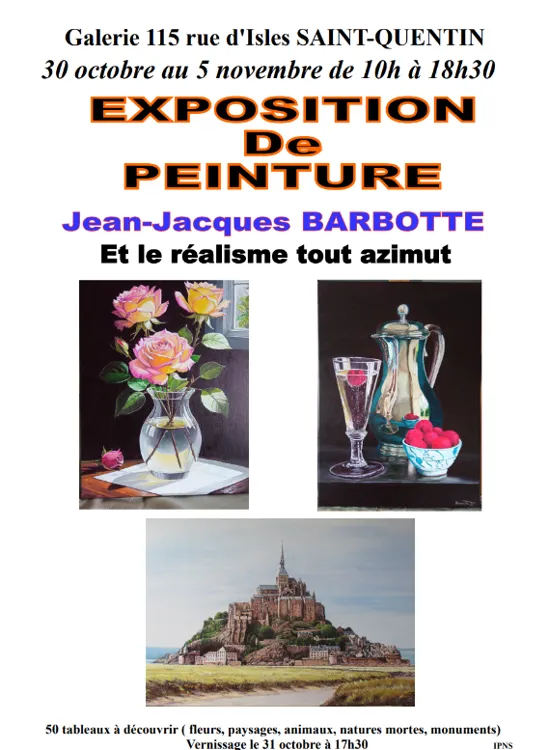 Le peintre Jean-Jacques BARBOTTE vous propose un voyage où le réalisme vous emportera dans des paysages bucoliques, des animaux aux regards expressifs, des fleurs où l'on pourrait presque sentir leur parfum, des natures mortes plus que vivantes, des monuments sublimés, un régal des yeux, dans un écrin de lumière.